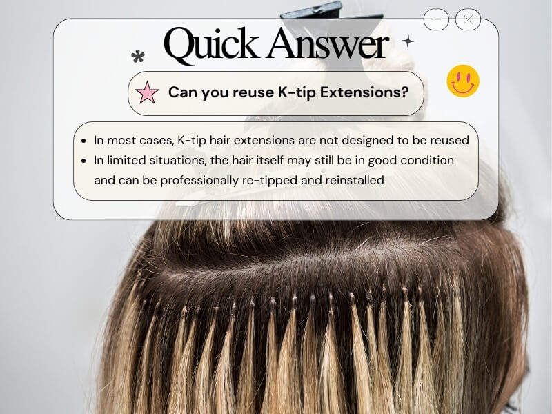 The question "Can you reuse K tip extensions?" has a nuanced answer: while the original bonds cannot be reused, professional re-tipping may extend the life of quality hair in specific circumstances. However, this option requires expert intervention and new materials, making it different from true reuse.